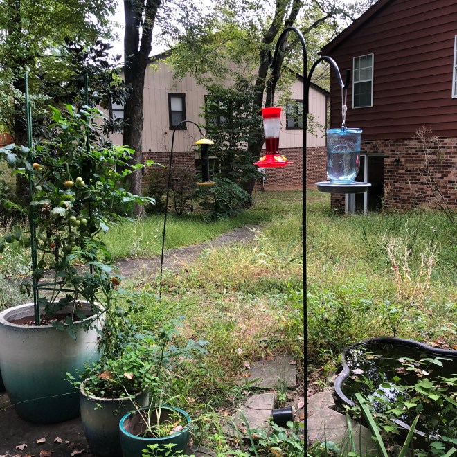 While we’re in the backyard, there has been another bird feeder reshuffling. This is very exciting news: we actually saw a hummingbird buzzing around our front yard tube feeder! After we all stopped jumping up and down and shouting, I darted out to Home Depot to pick up some nectar, and hung up Steve’s hummingbird feeder in the backyard, thinking we’d maybe entice a few more to stop by for fuel as they migrate south. Since then: no hummingbirds. Figures.