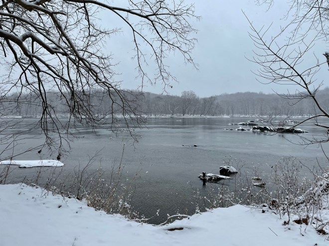 Hello, friends, happy new week to you all. What’s new with you? What’s new here is that we have SNOW on the ground – snow! As anxious as I am for paddling season to begin, I have to admit I’m giddy about our current brush with winter. While unpacking after our move this summer, I found my snowshoes – never used, tags still on – and have been waiting impatiently to use them. Sunday was the day! But I’m getting ahead of myself. Last week was another doozy at work, but thankfully, this coming week presents a bit of a lull, which I plan to enjoy. Two briefs filed and several other projects advanced, and I needed a brain break. I got one. On Saturday, I ran to the grocery store first thing and when I got home, we headed out for a hike, as we do pretty much every rain-free weekend day. I wanted to check out a potential stand-up paddleboarding spot for once the weather warms up, so we drove out to Beaverdam Reservoir in Loudoun County. I cased the launch spot, and then we wandered the lakeside trail for a bit before turning around and heading home. Everything aligned for a good ramble – the kids behaved, we had the right snacks, everyone was properly attired; good all around. We’ll definitely be back, and I plan to bring my board out there as soon as it’s warm enough to SUP. The rest of Saturday was laid-back; I ran out to the garden center to stock up on birdseed before the “big storm” and set up a new feeder station when I got home, then spent the rest of the day reading.