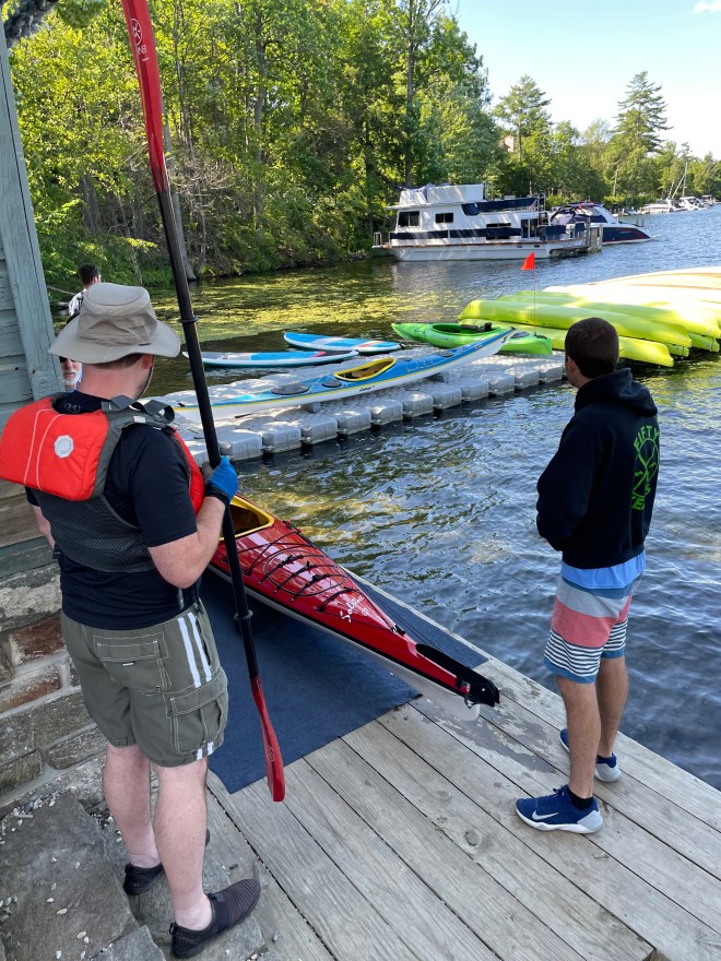 It was a bit choppy and windy on the lake, which the boathouse staff assured us was good – it would give us a feel for how our boats handled in a bit of rough water. (Not too rough. This was Lake George, after all.) We each slipped in and paddled into the small cove in which the boathouse had its dock.