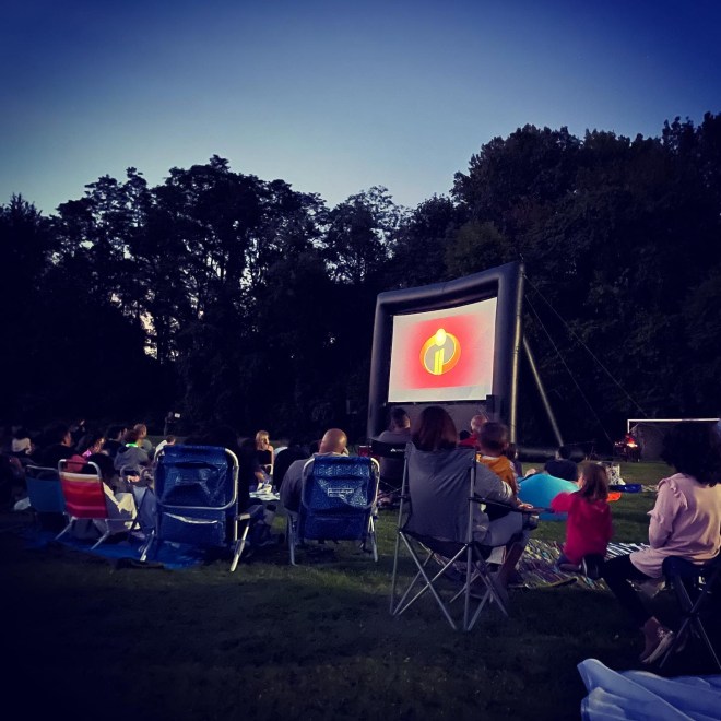 Loving. When we were shopping around for a new hometown in the spring of 2020, I read an article about the exurb hamlet where we ended up. The article painted an idyllic portrait of big yards (and often unreasonably big houses to go along with them, but let’s focus on the yards); neighbors gathering at the local coffee shop for Saturday morning vintage car shows; Fourth of July parades; and outdoor movies on the village green all summer long. After four years of city living (and before that, three years of cold loneliness in western New York) that warmth was just what I wanted. We had to wait for it – for obvious reasons, most of the local town activities were cancelled during our first summer here (and our second, too). But this weekend I finally got a taste of what I moved for (along with outdoor space, cheaper rent and better schools, of course). The PTO at the kiddos’ elementary school hosted its first event of the year – a movie night, discussed above. I thought it was a virtual event and that we’d all watch The Incredibles 2 at home on Disney+… so you can imagine my surprise when Steve told me no, it’s a real event, with tickets and popcorn and everything. We rolled up to the school as the sun was setting and the PTO volunteers were inflating the big outdoor movie screen. We staked out a spot, set up our camp chairs, and not seconds later were attacked with hugs by the mother of one of Nugget’s tee-ball teammates (and kindergarten classmates). (“I’m a touchy person,” she said, rubbing my arm, “I hope you don’t mind!”) She introduced us to her in-laws, nieces and nephews before the whole bunch of them wandered off to find some ground that wasn’t already taken. And I turned around to see two neighbors – and new bus stop friends – waving. Steve and I wandered to their blanket (the kids had long since decamped for the playground and basketball court with a clump of friends) and we chatted about the block party they’re planning – the last one was a dud, apparently, and they have their minds set on redemption. And then it got dark, and we snuggled in to watch the movie under my favorite orange shawl, and I oozed with gratitude for this little town and these warm people, and finally getting to experience the charm that we moved here for.