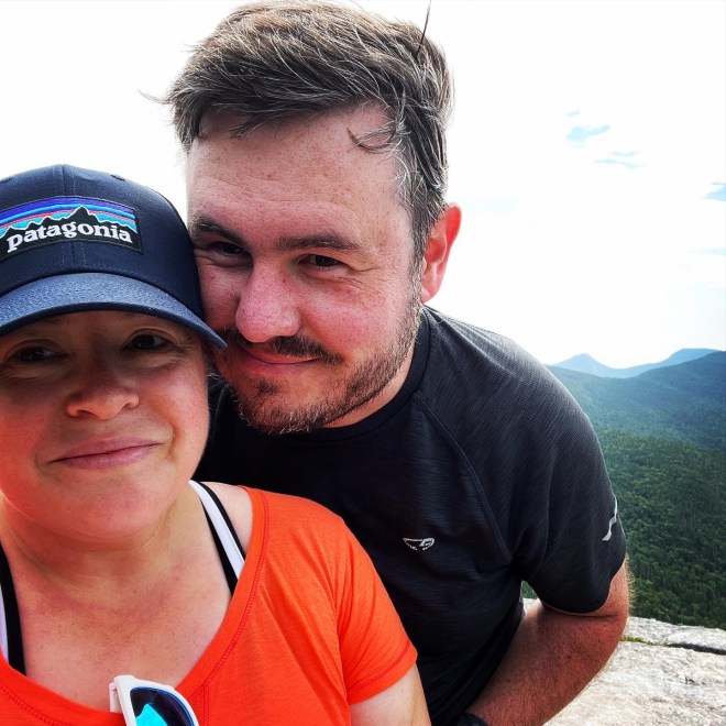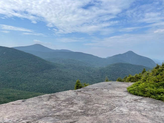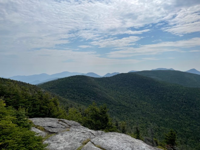 The last mile was an Adirondack mile, to be sure – scrambling up creekbeds, grasping at tree branches, heaving over boulders, and gaining about a thousand feet of elevation in the final third of a mile. No pictures, because my mind was completely focused on the job. But eventually, we pushed over the final boulder and found ourselves on a windswept summit ledge.