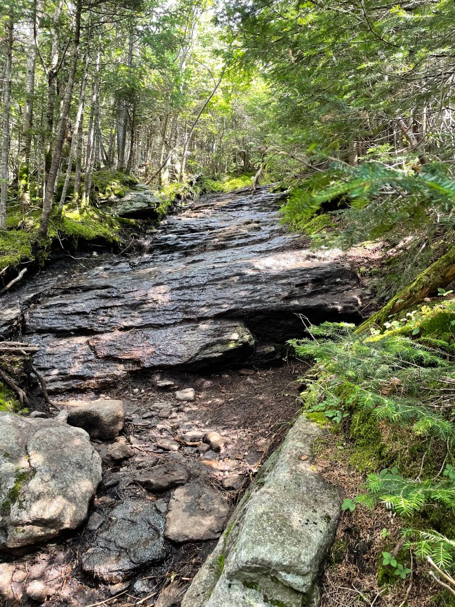 After Marcy Dam, the trail begins both to climb and to look more like an Adirondack trail. Saw that coming a mile away – no, I mean literally.