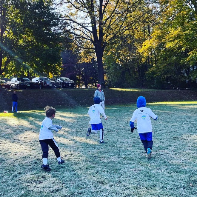 It wasn’t all bad. We had soccer on Saturday morning – the penultimate game of the season; it was supposed to be our last, but since we were rained out last weekend the league is allowing makeup games. As you can see, it was frigid. The entire field was frosted over and there were a bunch of little red-nosed soccer stars running around. I spent most of the game hopping up and down and hugging myself, and conducting a lengthy Halloween post-mortem with Nugget’s friend M’s mom Kate. Nugget did well but his feet got pretty cold; by the fourth quarter he was begging to switch to the other field, which got more sun (at his age, the kiddos play four-on-four over two small fields). The coach was reluctant to put him in, because – as he explained – they were trying to keep the score relatively even between the teams, and it was already lopsided in our favor, and Nugget is just too good. I pulled all my persuasive skills out of my bag and talked the coach into putting Nugget in on the sunny field anyway; he just had to promise to only play defense and not score more than two goals. (See, Nugget, never say having a lawyer mom didn’t do anything for you.) It took a few hours to thaw out after the game, but by midday the temps had climbed and I headed out for a run (!!!) – and not just any run: my favorite run of the season, the Marine Corps 10K (virtual again this year, thanks for nothing, ‘Rona). And then I figured I had earned a couch potato afternoon – after Nugget and I put a pound cake in the oven. Yum.