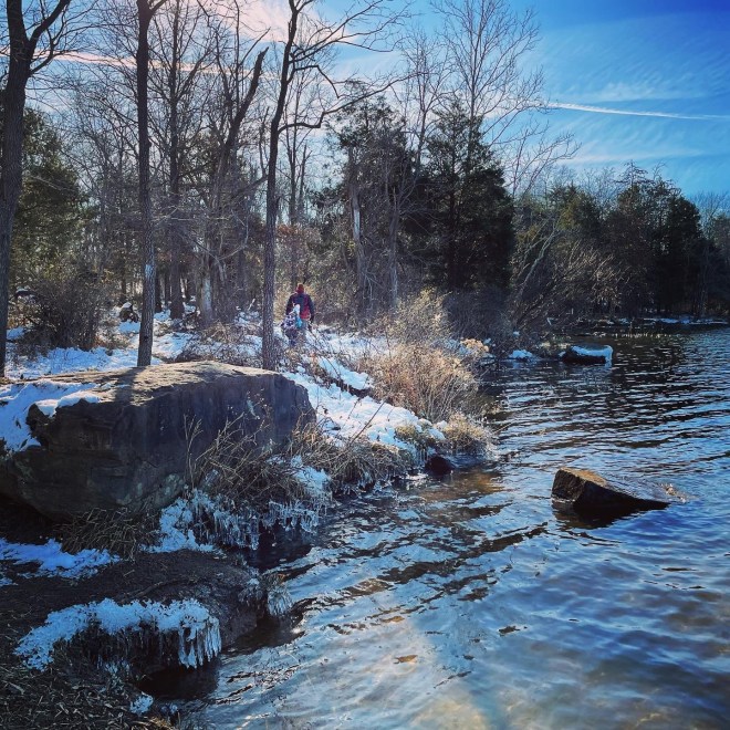 Brrrrrrr. Happy Monday, friends! It is JANUARY out there, with a vengeance. Are you staying warm? I’ve been keeping a good balance of coziness with outdoor time – because it’s not fun to wrap up and be cozy unless you get a little cold first. On Saturday, we all really needed a nature release. Last week was… fine, you guys. It was fine. The kids were off school all week long with five snow days in a row, but THIS IS FINE. They haven’t been at school since December 17, between their holiday break and then this snow, but IT’S FINE. So – yes, we really needed a nature release. On Saturday morning we drove over to my favorite local paddleboarding spot, Beaverdam Reservoir, to hike part of the perimeter trail around the lake. (When we were halfway to the lake, Steve jokingly said, “Oh no! You forgot your paddleboard!”) It was a little too cold to be out on the water, but gorgeous. The day was one of those clear winter days that feel almost brittle – in a good way. The reeds and rushes around the lake were crusted with ice crystals and the trail was sparkling. Really – gorgeous! After our hike Steve and Peanut stayed inside to warm up, but Nugget and I headed right back out to meet up with his buddy P, and P’s brothers, at a park in our tiny village center. The boys bypassed the playground entirely and headed straight for a hill (leading down to the sports fields) – rolling, penguin belly-sliding, and sledding followed. Nugget had been begging for a play date with this particular little guy for weeks so I was glad it finally happened, now that the holidays are over. He needed to roll and wrestle with someone other than Peanut.