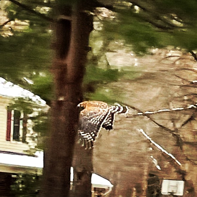 Loving. I’m a broken record, but on my walk yesterday I was reminded again why I love living out in the exurbs. (And why it’s always a mistake to leave my camera at home – blurry picture alert.) As I rounded my least favorite corner in the neighborhood (we call it “Dead Man’s Corner” for the combination of poor visibility, an easily-ignored stop sign, and cars that like to fly around the corner taking a racing line on the side of the road where the law requires pedestrians to walk – ugh) a quick movement caught the corner of my eye. I glanced over and saw a majestic hawk. Hawks are actually quite a common sight out here – I see them almost every day, either on walks or while driving – but this one flew just a few feet up into a small tree in someone’s front yard, and I realized that he was joining a female hawk, almost certainly his mate! (We have a few breeding pairs in our neighborhood.) I stopped to gape for a few minutes; they noticed me and took off in opposite directions, and the male flew right across the road in front of me looking for shelter in a neighboring yard. Just in the past week I’ve seen multiple hawks, a bald eagle soaring overhead, and a stunning orange fox. I love living in a place where these wild neighbors are so visible – seeing them never ceases to amaze.