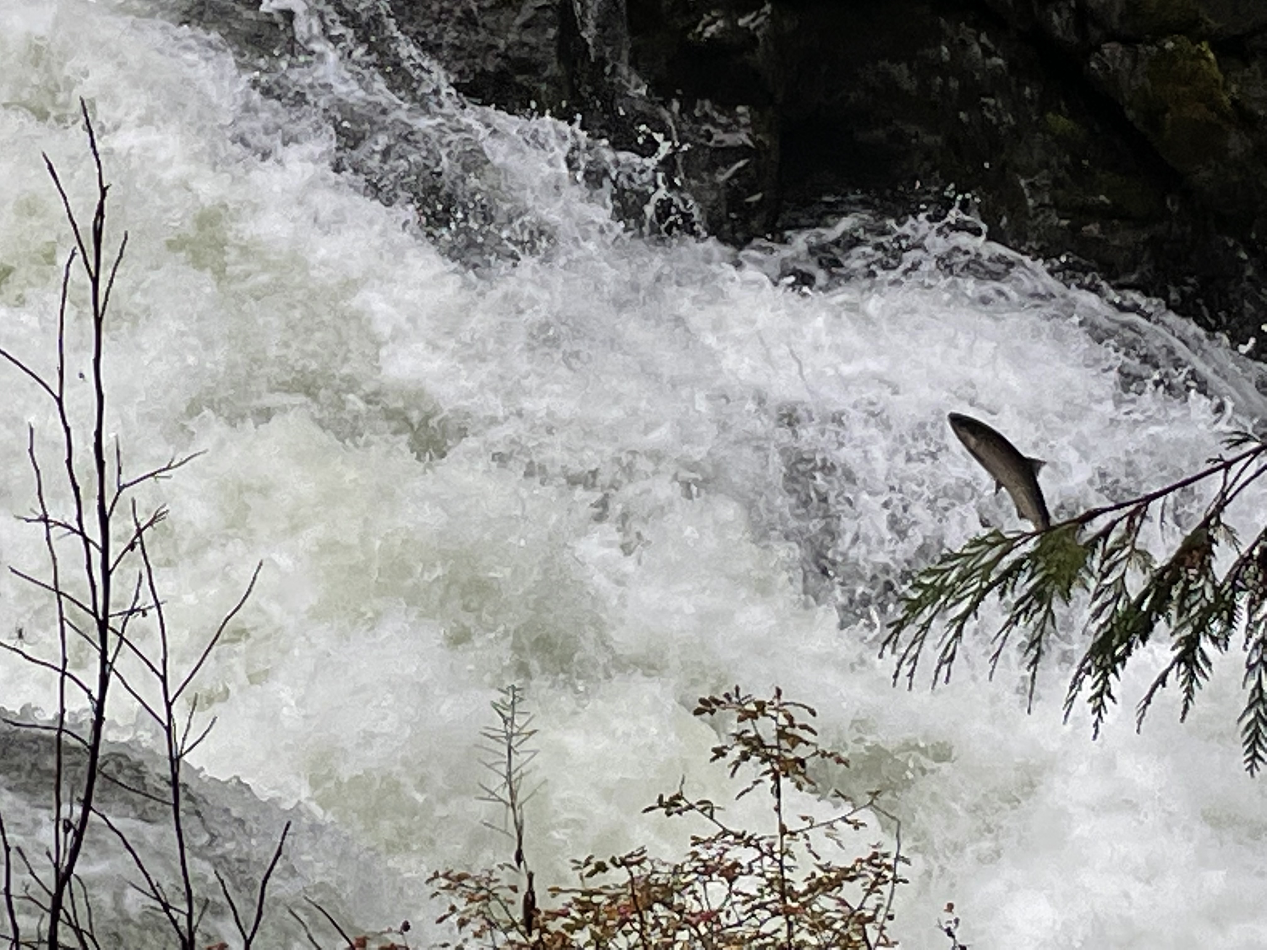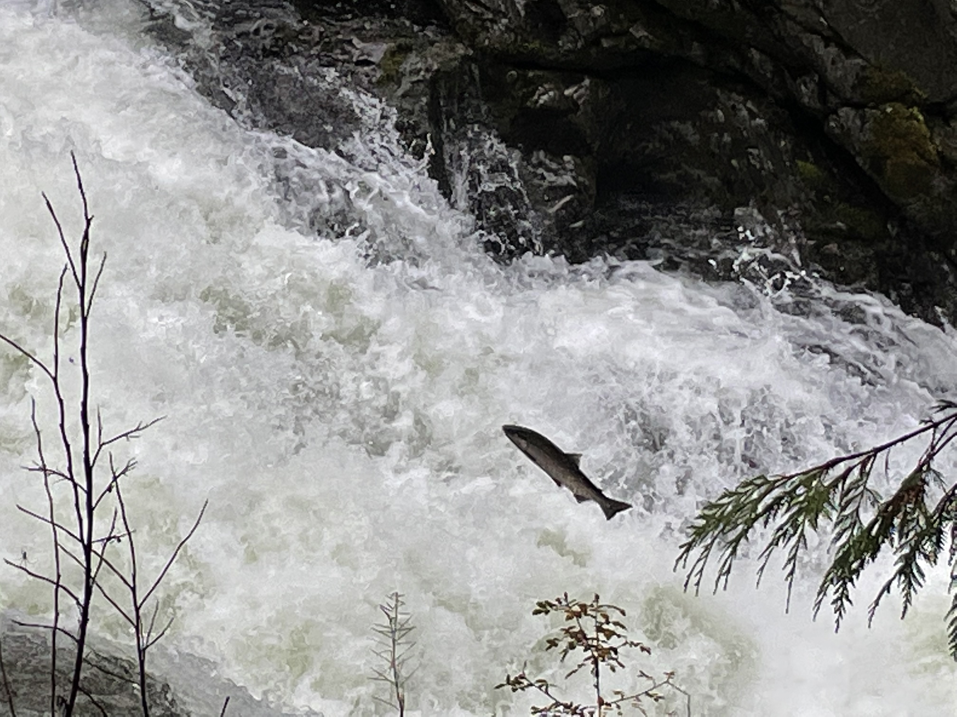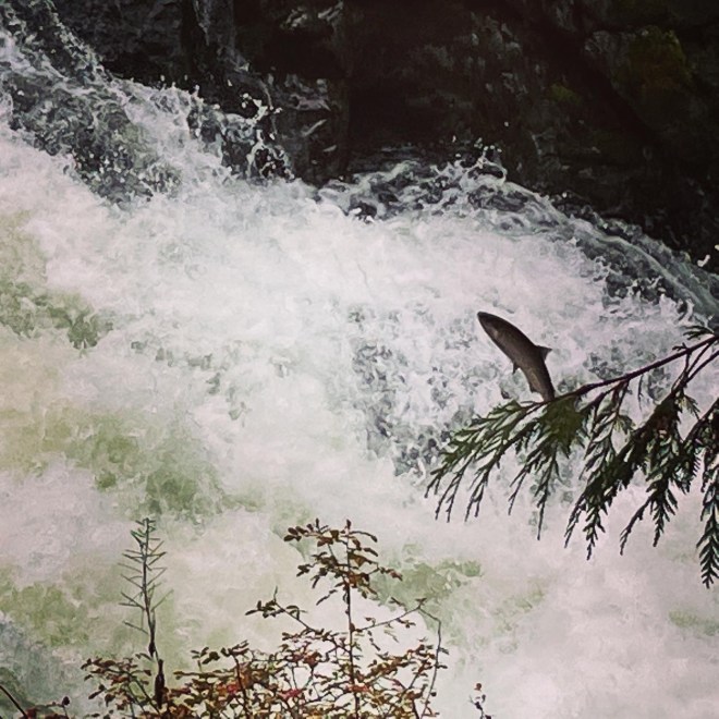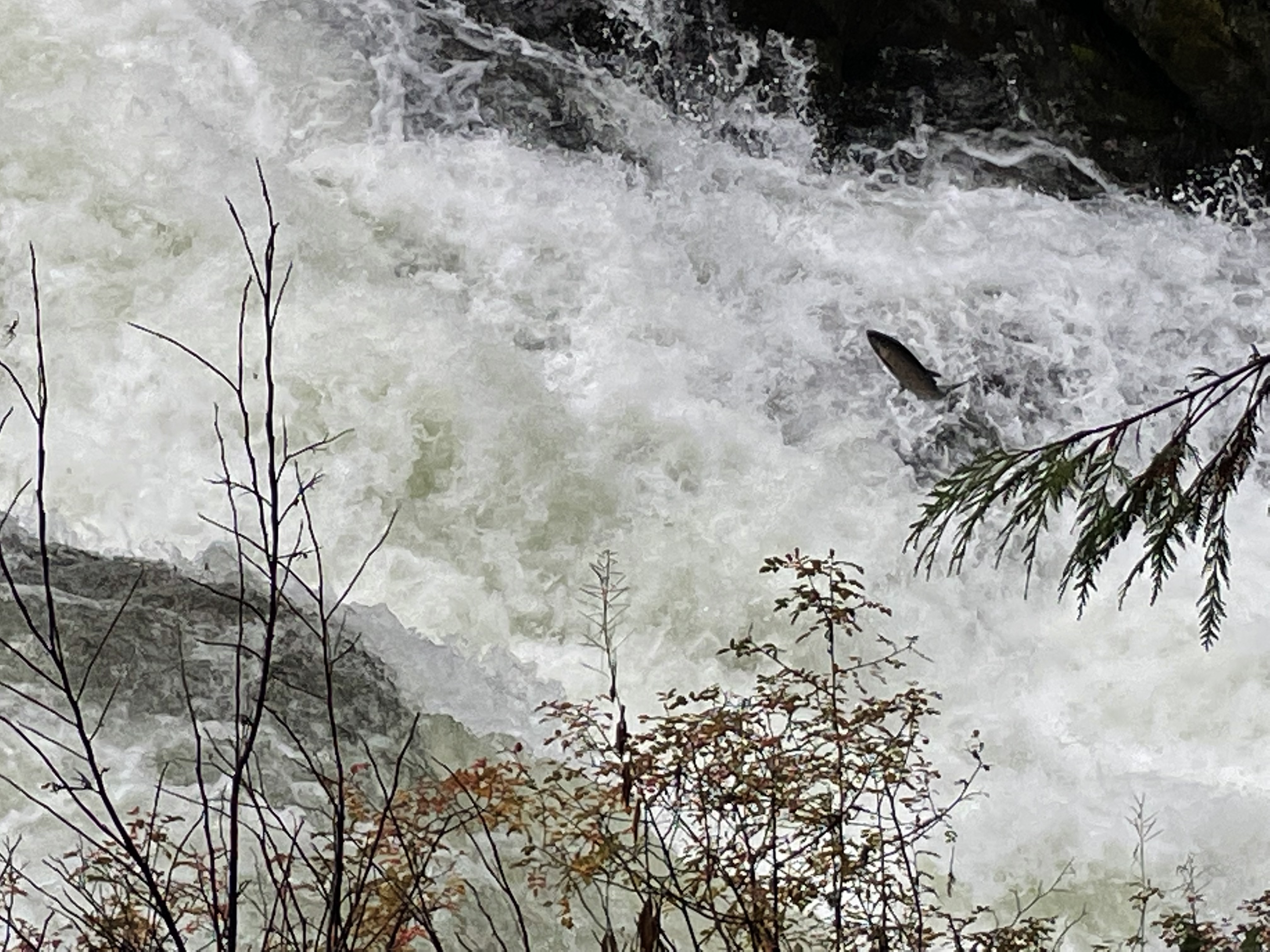 It was truly incredible. I was vaguely aware of the salmon run (I thought I’d seen the sign, but not really registered it, on our way into the rainforest) but never really thought I’d actually find myself leaning over a wooden railing, watching coho salmon fly through the air on their way up a waterfall.