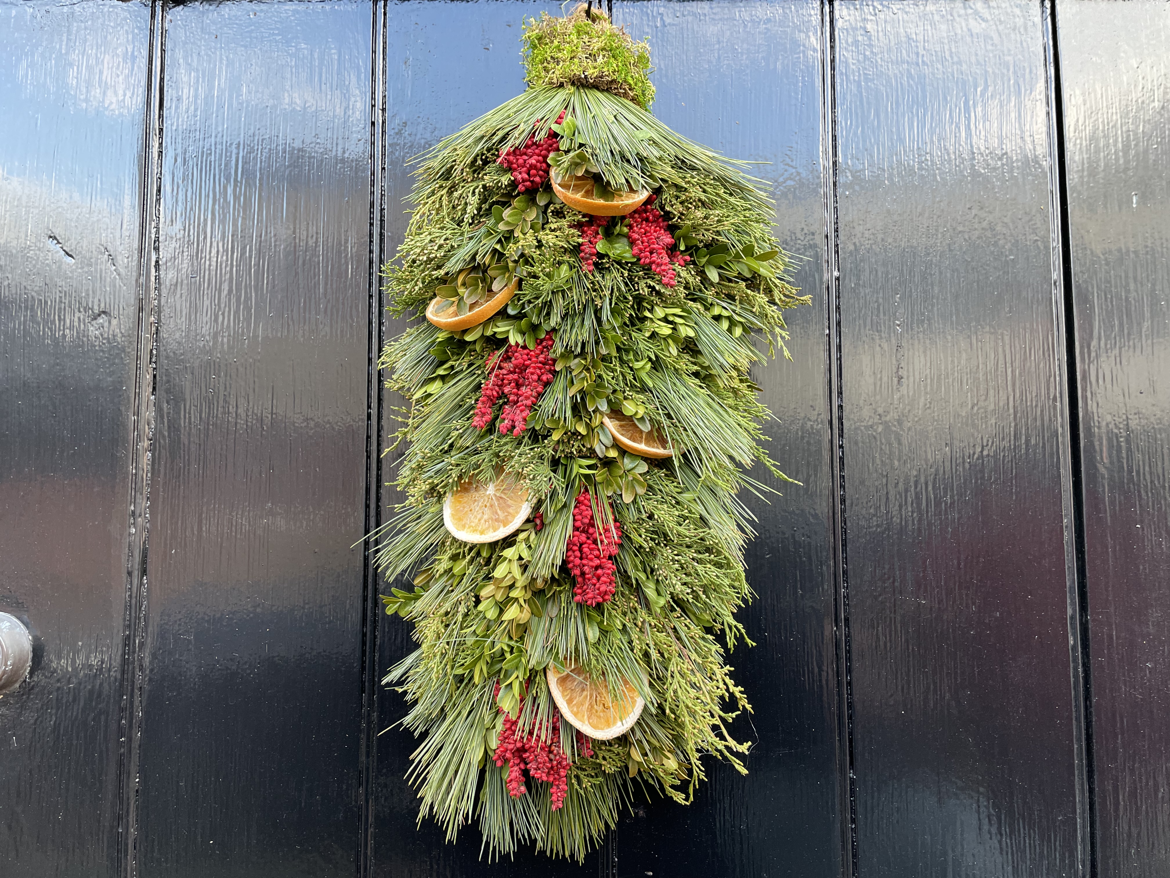 After visiting the Nativity, we started our walk around Old Town. As usual – lots of beautiful wreaths, lots of greenery, and fruit accents. I considered drying out some orange slices or maybe doing orange and clove balls at home, then decided against it. Any added work sounds like too much this year. Walking around and looking at other people’s efforts was the sweet spot.