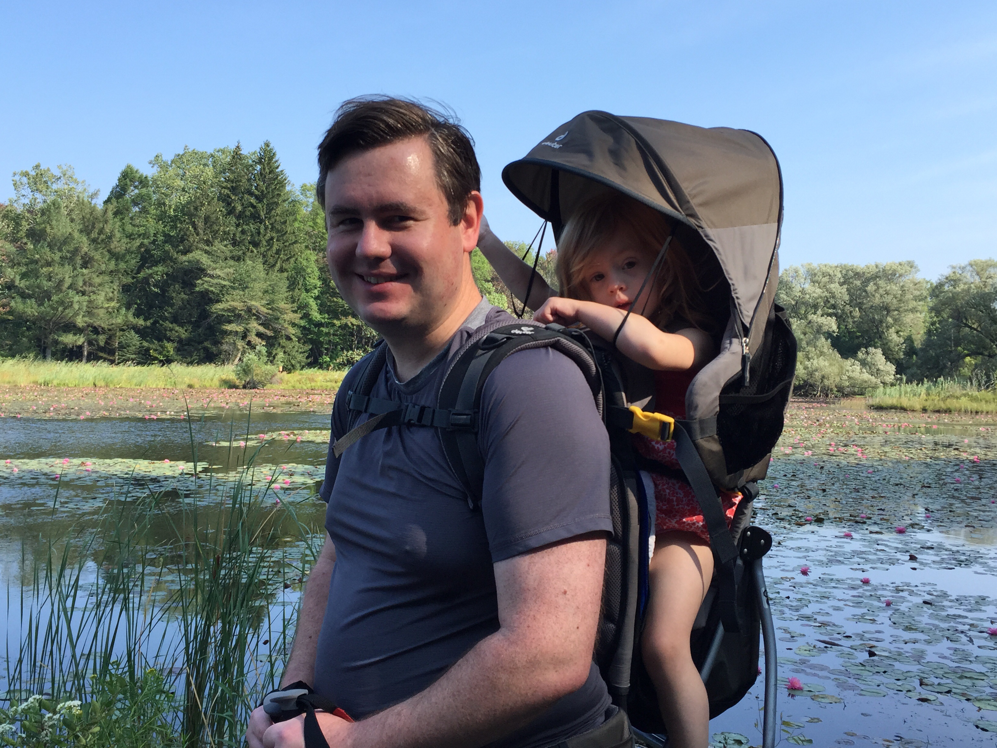 I love ducks – they’re so adorable. This crowd wasn’t shy at all. There’s a sign instructing park visitors not to feed the wildlife, but I don’t think most people abide by it. These ducks have definitely gotten used to being fed by humans – they came right up to us wanting bread. (We didn’t have any, and didn’t feed them.) Peanut had a blast climbing up the rocks, running around on the grass, and checking out the new arrivals to the duck pond. And Nugget had a blast watching his sister play.