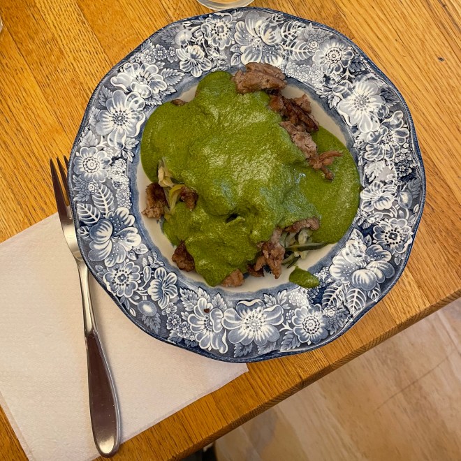 Sunday: Paleo golumpki. I like to make elaborate Sunday dinners, and on this occasion I decided to recreate one of my grandmother’s standbys, adapted for Whole30. Traditional golumpki, or golabki, includes a mixture of beef, pork, and white rice, wrapped in cabbage and doused in tomato puree. Rice is not Whole30 friendly; beef and pork are, but I don’t eat them. So I made some adjustments: ground turkey instead of beef or pork; cauliflower rice instead of white rice; and tomato puree with almond milk whisked in instead of soup. Served in my grandmother’s bowls – I’m sure my version wasn’t as delicious as hers, but it did the trick! Yum.