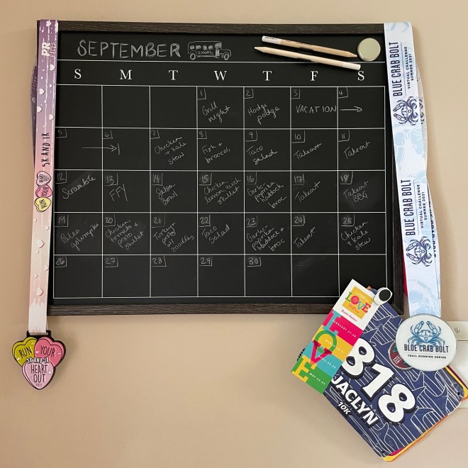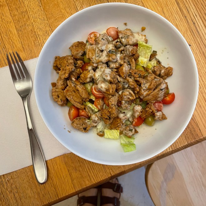 Wednesday: taco salad. There’s lettuce under there, I swear! Many Lego Movie jokes were made as we had “Taco Tuesday! But still! On a! Wednesday!” The taco meat was ground turkey again (apparently I had a theme going this week) sauteed with mild salsa and Southwest Seasoning from one of my favorite local spice shops. Served over a head of romaine that I needed to use up, with sliced cherry tomatoes, a sprinkling of olives, and Primal Kitchen vegan ranch dressing. I love salad, and this might be my favorite (although there’s usually more lettuce – this head was getting a little past its prime and I had to cut away parts).