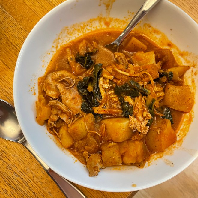 Saturday: chicken stew with potatoes and kale. On Saturday, we were out apple-picking and didn’t get home until after 5:00, but I had pre-cooked dinner a couple of days before (and was dipping into it for lunches during the week) – a big batch of chicken stew with butter potatoes, kale, and some cabbage left over from Sunday’s golumpki-cooking adventure. I love to make big chicken stews and throw in whatever veg I need to use up; it’s not Steve’s favorite, or Peanut’s either, but they eat stew gamely enough and Nugget and I love it. Even when I’m not Whole30-ing, chicken and vegetable stew is a menu regular during the colder half of the year.