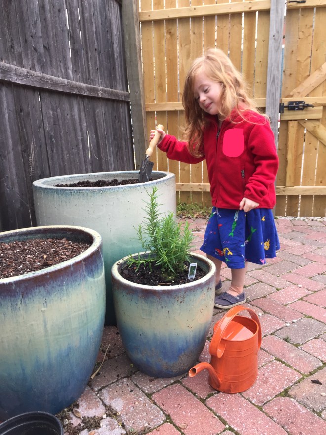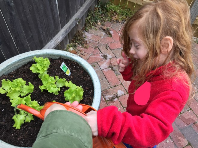 When I last left you, we’d gotten plants into three pots (which we moved from New York, much to Steve’s chagrin – they are heavy – because I love their colors). Peanut and I planted lettuces in the big pot, beans in the medium pot and rosemary in the small pot. We’d jumped the gun just a bit on buying our plants and hit the garden centers before many edibles were ready, with the result being that I had to buy something to avoid a preschooler meltdown.
