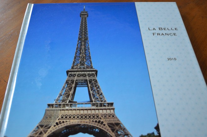 I made a Shutterfly book after my trip to France in 2010 and was thrilled with the result. The process was simple (and I imagine it’s much the same on other photo-processing sites). First I uploaded the photos I wanted to use from my computer onto Shutterfly. I then chose which pictures I wanted to go on each page of the book, as well as the front and back covers. The site allowed me to play with the layout of each page until the pictures were set out exactly as I wanted them. I was able to choose from several color themes for the book, each of which came with a number of background page options.