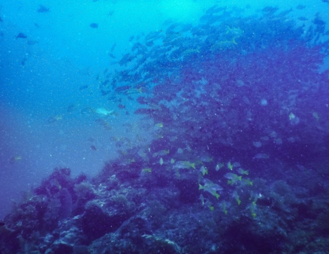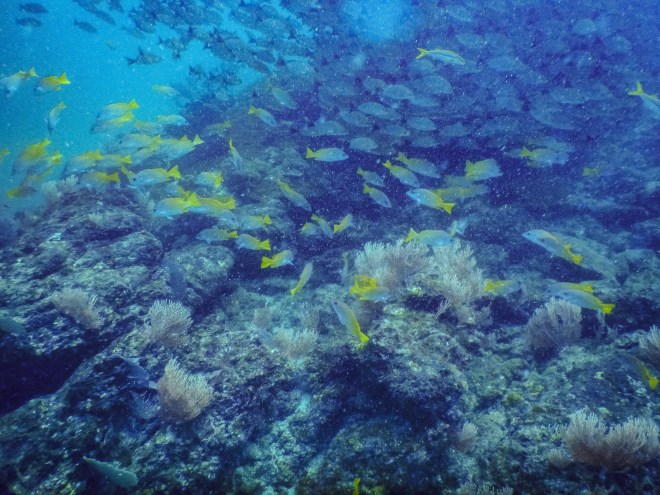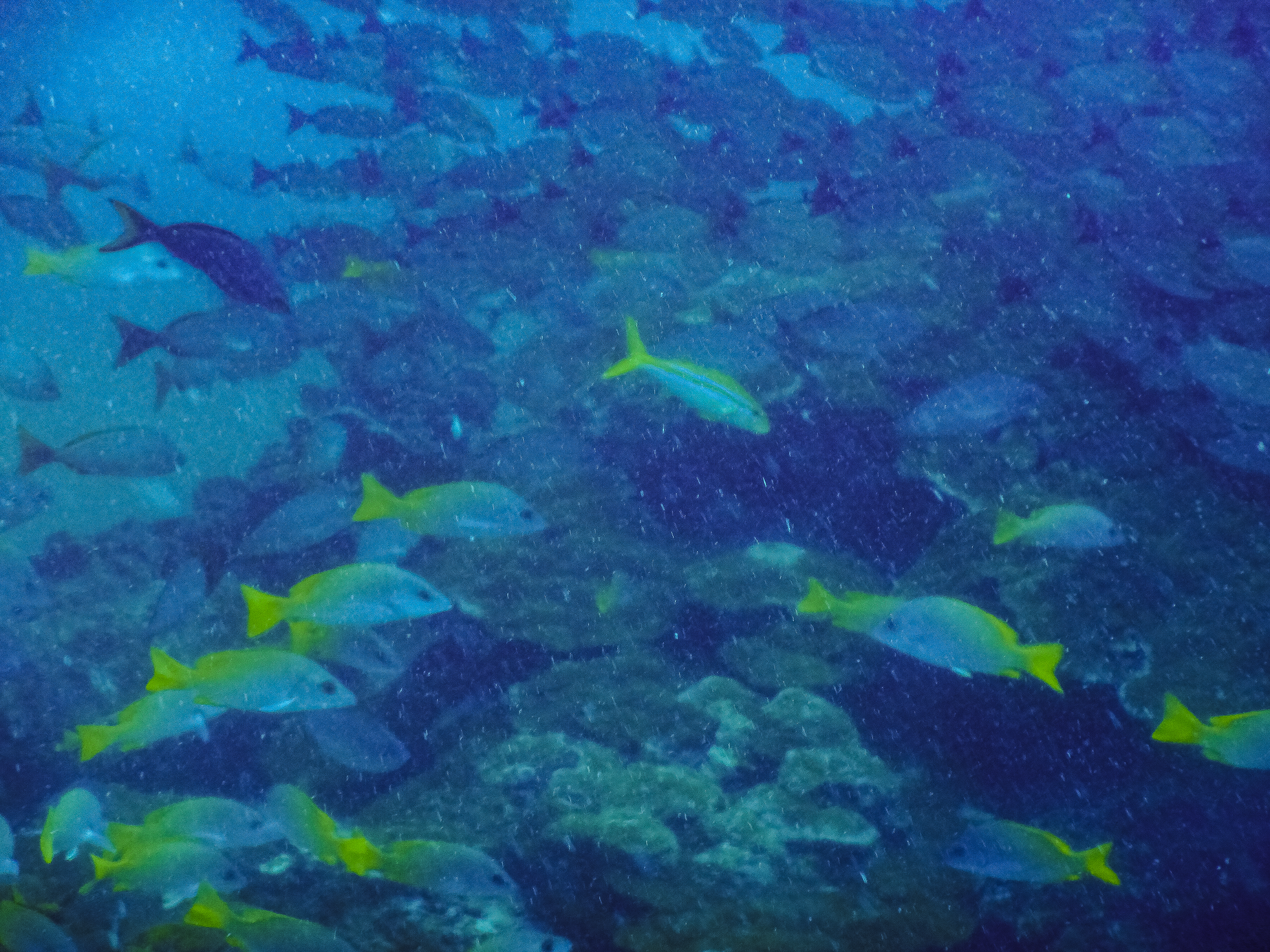 A river of “goggle eyes” on our last dive. I started diving to face and overcome a fear of fish, so to rest peacefully in the water and take in this site – and find it impressive and moving instead of terrifying – was a huge victory for me.