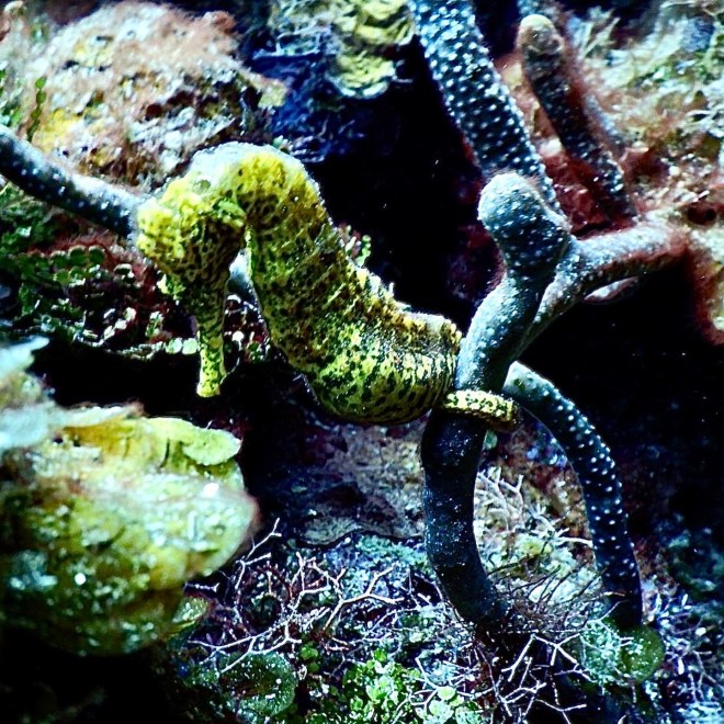 The opposite of hardcore: this seahorse. He was actually very large for a seahorse – several inches, with a big pregnant belly – and bright yellow. Our dive buddy, Emily, described him as a Giant Cartoon Seahorse.