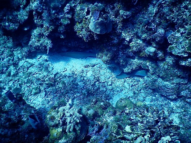 We did not see any whale sharks (wrong season – they do turn up anytime during the year, but July is not their big migration time so they’re a rare sight) or hammerheads, much to Steve’s dismay. (We’ll just have to go back to Roatan – twist my arm.) But we did see a massive nurse shark sleeping on the seafloor. See the dorsal fin and long tail tucked away? Look closely.