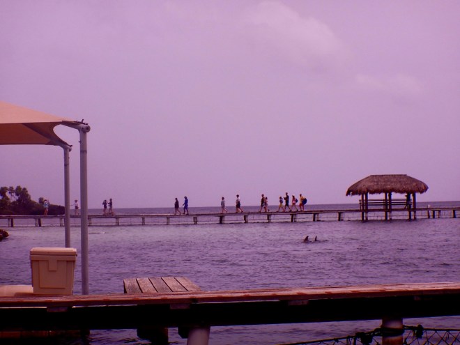 During one surface interval, Justin drove us past the dolphins at Anthony’s Key, one of the biggest resorts on the island. Worth noting: this is not a holding pen. The dolphins are free to come and go as they please; those that were swimming around between the docks were there by choice, much to my relief. (Also, please excuse whatever is happening with the color in this picture. I don’t know why it’s all purple.)