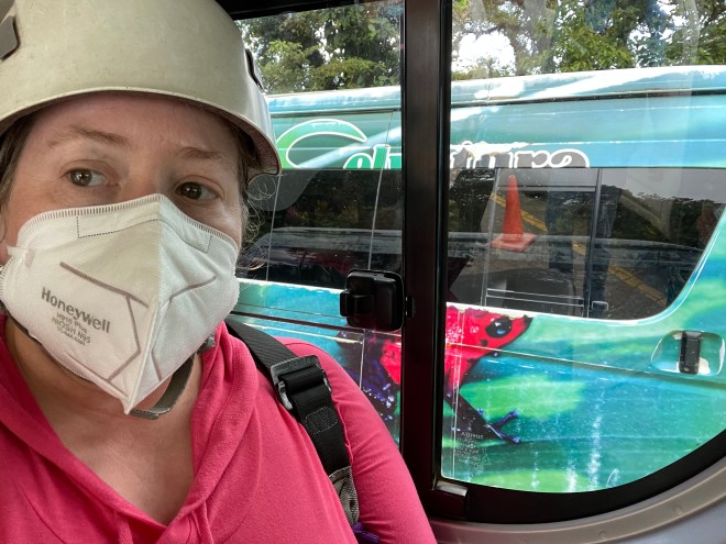 On our last afternoon in Monteverde, I had a solo adventure planned – ziplining! Steve had no interest in joining me, but I didn’t want to leave the home of ziplining without putting on a harness and finding out for myself what it feels like to fly. At first, I was thinking of doing the Original Canopy Tour, which I had heard was the very first recreational ziplining experience anywhere in the world and is still in operation today – but after chatting with a few different people (including our dive buddies from Osa, Garry and Donna) it seemed like Selvatura Adventure Park, another option, was the most popular. So I booked it, and when the time came left Steve relaxing at the hotel and waited anxiously for a bus to pick me up and drive me to Selvatura.