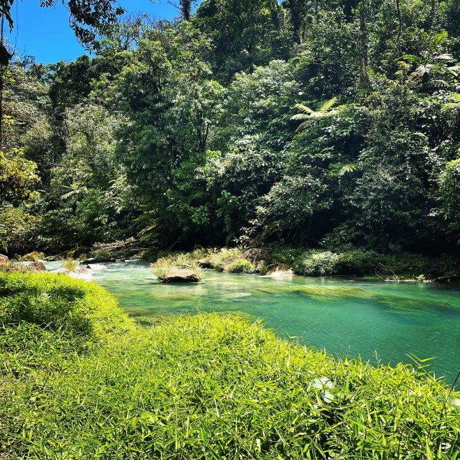 After we’d stood and drunk in the view for awhile, we turned and began the agonizing climb back up the stairs (oof) and then had a decision to make. The trail continues on for miles through the forest, past multiple beautiful landmarks – we could keep following it, or we could turn back (having seen the main view we came for). The next stop on the trail was Laguna Azul, which was only a little more than half a kilometer onward. Now, how could we resist a blue lagoon? Clearly we had to keep going, at least to that point. The mud and uneven ground and climbing continued – if anything, the trail got more intense (but less crowded, so that was something). Was it worth it? See for yourself: