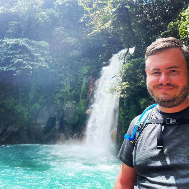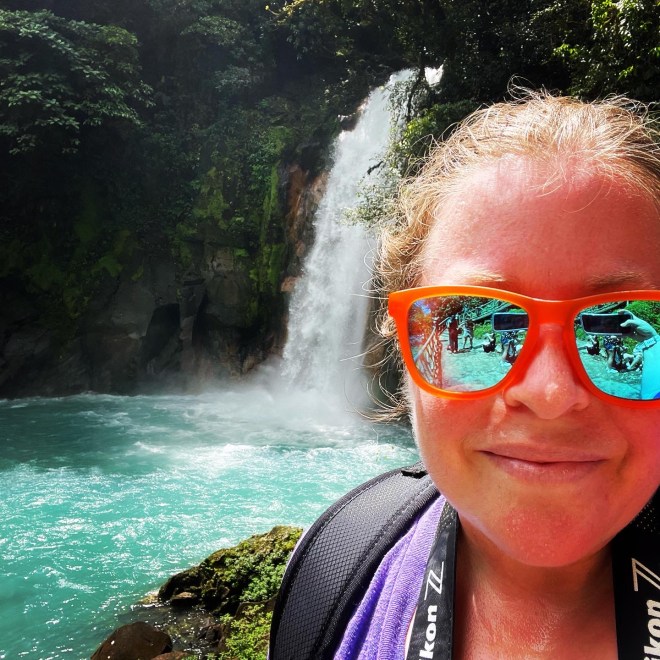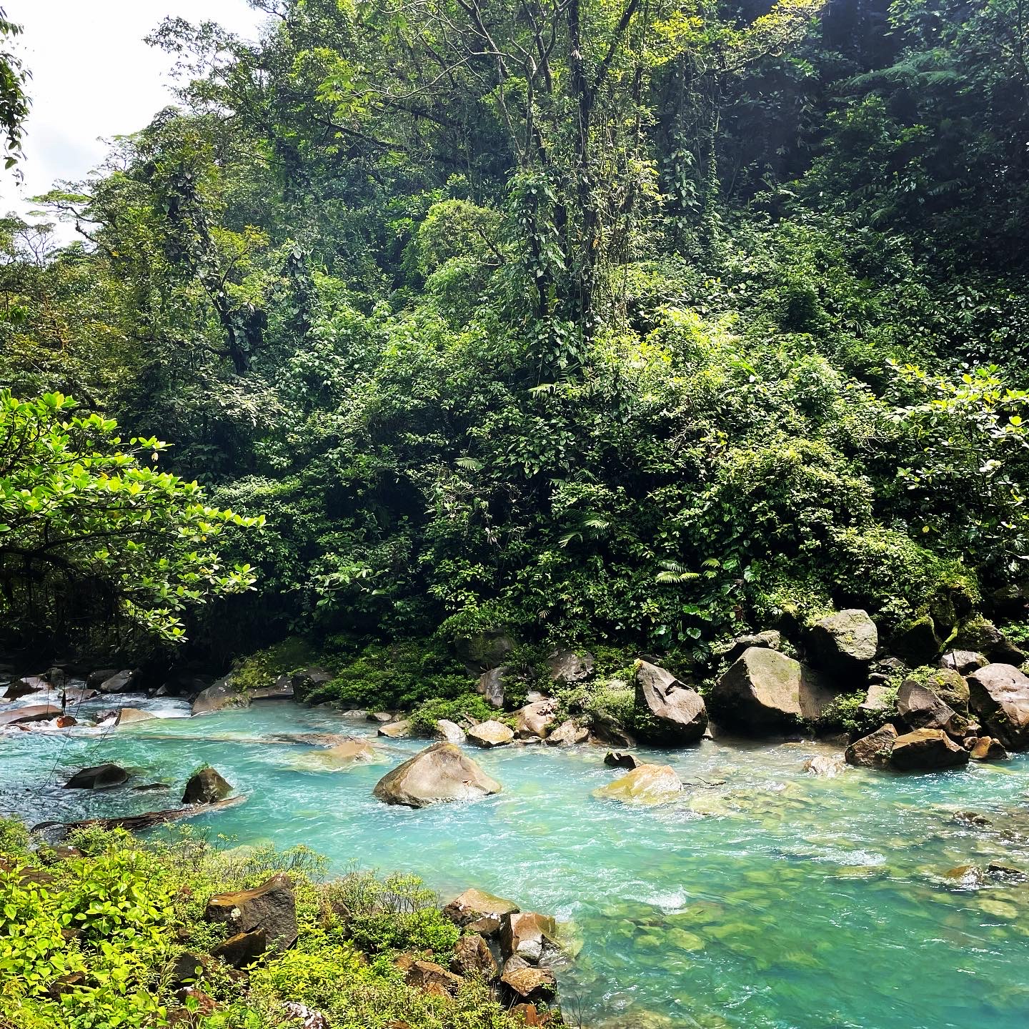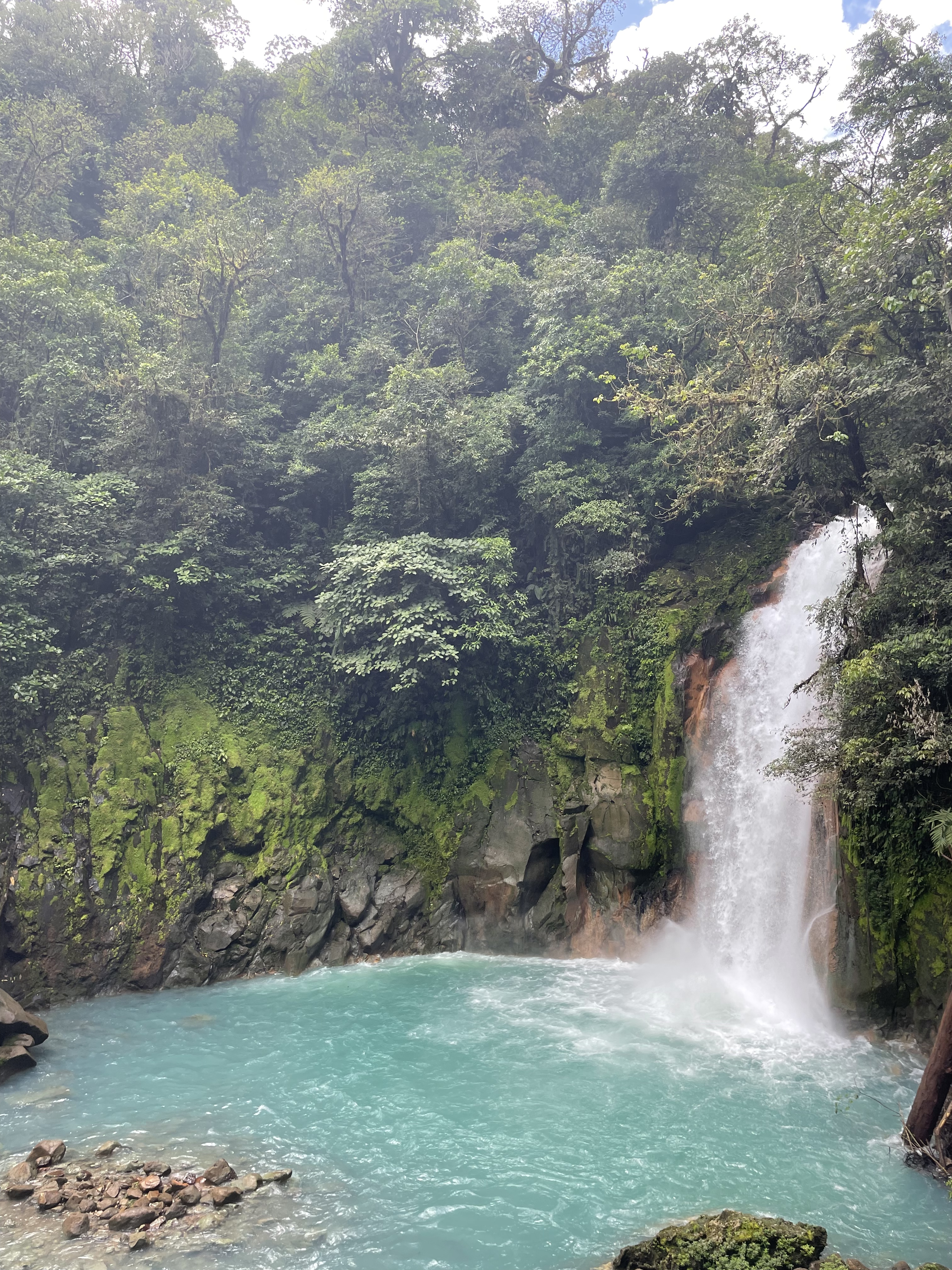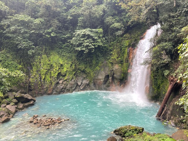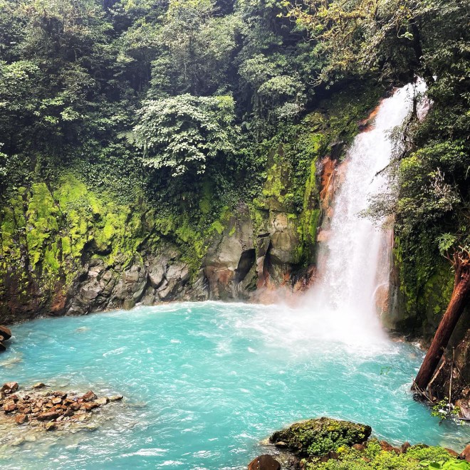 Catarata Rio Celeste pours into a milky, electric blue, pool surrounded by mosses and overhanging trees and spilling out onto a rocky streambed – absolutely enchanting.