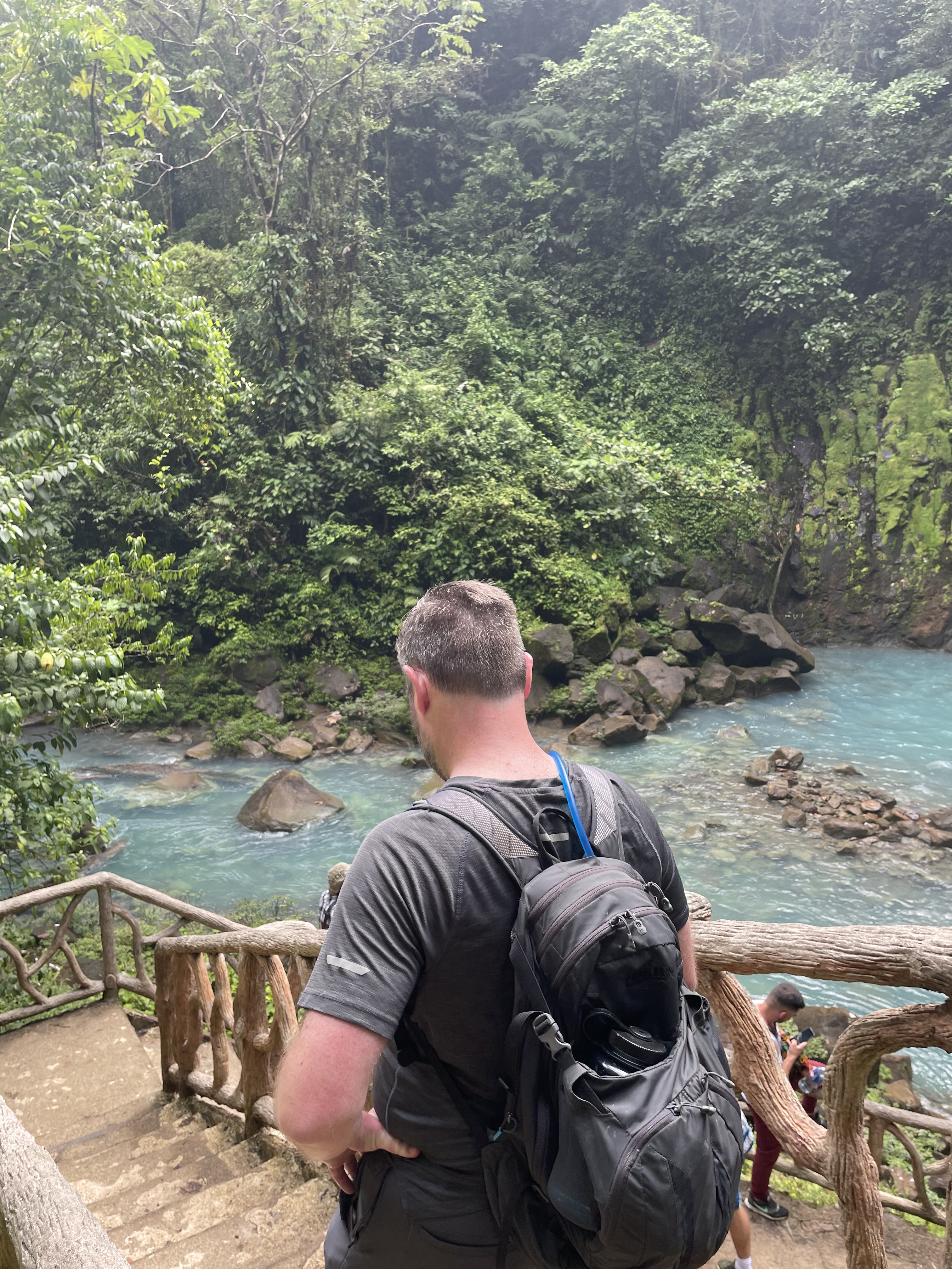 I’d have loved to stay and explore more along this captivating trail, but we were hot, tired and hungry – and we had a long road ahead to Arenal. It was time to turn back, and catch one more glimpse from way above Catarata Rio Celeste as we moved on to our next stop. This was just a short interlude, but about as memorable as they come.
