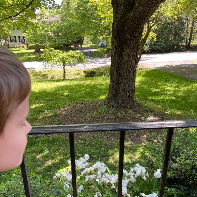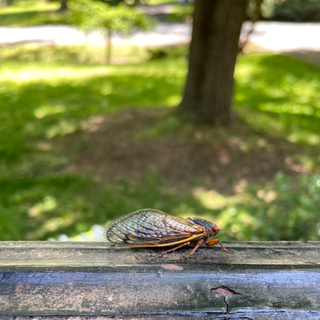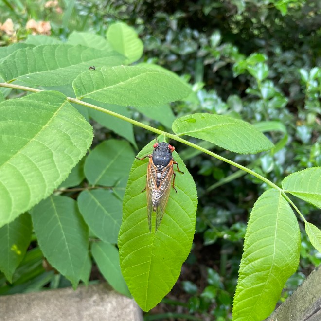 The male cicadas arrived last week, and the females surfaced this week – and the decibel levels are noticecable, even for me. (I grew up listening to cicadas humming in my Grandmama’s backyard on Long Island, and I barely hear them; it’s just white noise to me.)
