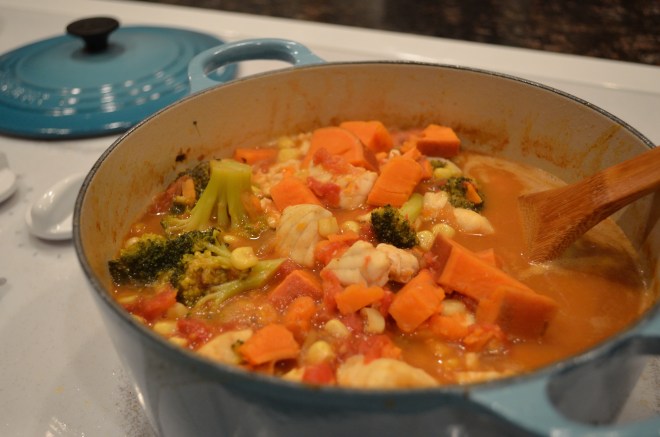 I’ve been meaning to post this recipe for the past month. Lately I’m loving the following things: (1) one-pot meals with tons of veggies; (2) frozen fish fillets from Costco; (3) dinners that come together quickly. This dinner fills all three categories. It pulls together without a lot of work (just a little chopping, but I like a little chopping at the end of the day – it helps me wind down from work and get into the evening frame of mind), and it’s a great way to use a few fish fillets without roasting or sauteeing them – my go-tos, but it’s good to mix things up. We’ve been eating a lot of stew lately – lentil-vegetable; chicken and herb; or fish. It’s nice healthy comfort food that I can whip up quickly so that the adults in the house can all eat a home-cooked meal before we begin the bedtime dance with Peanut.