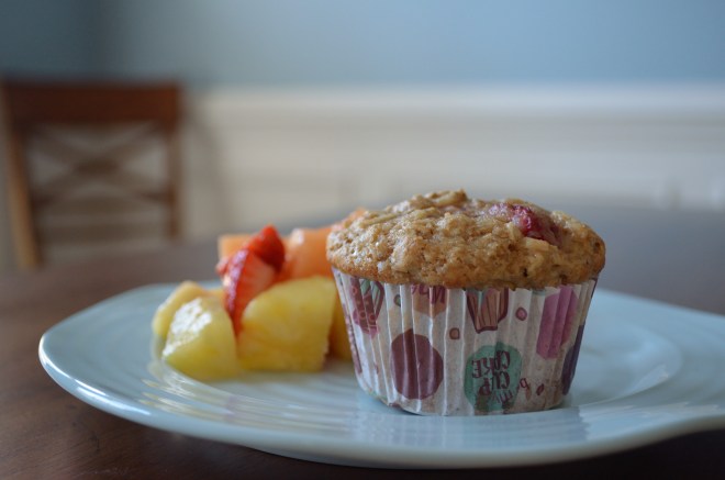 Hubby has this little habit of making suggestions.  Usually, his suggestions involve things that I should bake.  (This is clearly a strategy on his part – he knows he’ll get the baked goods when I pull them out.)  This past weekend, my mom, aunt and friend were visiting, and hubby suggested me right into baking muffins for them before they woke up on Sunday morning.  (I’m an early riser.)  I thought first of making a batch of banana muffins, but I had a beautiful box of strawberries in my fridge, and the end of a bag of sliced almonds, and strawberry almond muffins were born.  They were the perfect fuel for a day of walking the monuments on my girls’ weekend, but I’m sure they’d be perfect for lazier mornings too.  These muffins are officially in the rotation.